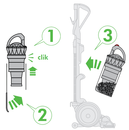 - Push the cyclone and clear bin unit into the main body of the machine; it will click into place.